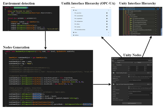 The connection via OPC-UA between UNIFIK and UNITY through the OPC.UaFX library was created through the following steps: (i) detection of the environment to be connected through the OpaUaClientBehaviour script; (ii) creation of a replica of the UNIFIK OPC-UA data in the UNITY environment; (iii) generation of the nodes, in UNITY, that give access to the variables (tags). In this way, the same hierarchy of nodes and variables was achieved in UNIFIK (physical environment) and UNITY (digital environment), achieving a bidirectional communication between the virtual environment and the physical layer (see Figure 6).