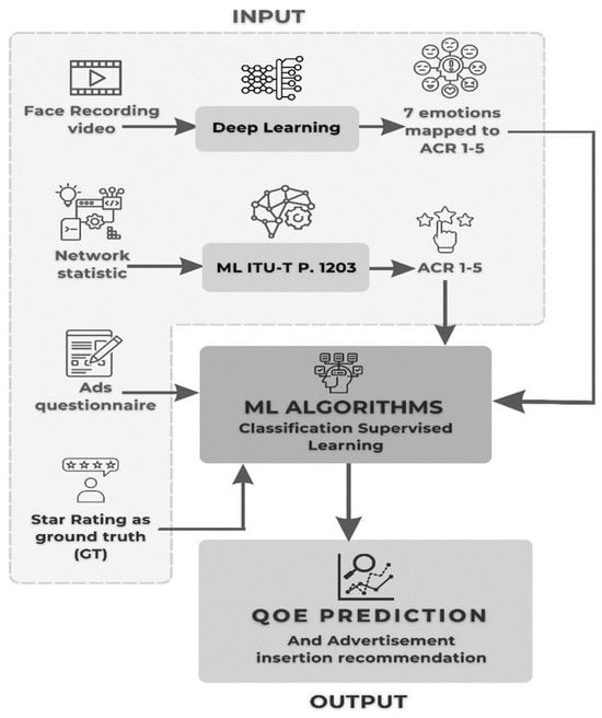Video services and related technologies have rapidly advanced in recent decades. Inferring Quality of Experience (QoE) from encrypted data in video streaming apps is a complex task that network service providers must address. All abbreviations are listed in Table A1 and can be found in Appendix A. Furthermore, network providers must maintain the highest possible quality by effectively managing traffic and responding to outages in real time. Owing to the limitations of the inference capabilities of encrypted data, traditional techniques that depend on deep packet inspection cannot be used to successfully infer QoE in encrypted network traffic []. Consequently, various sophisticated algorithms that use machine learning (ML) methodologies have recently been proposed to forecast QoE indicators [,]. QoE is a metric used to determine how a user experiences a certain service. We believe that good Quality of Service (QoS) can lead to acceptable QoE []. However, for deteriorated QoS (high jitter, delay, and packet loss), the chances of obtaining adequate QoE are low. In this study, objective QoE refers to QoE that can be calculated without any user feedback, and subjective QoE refers to 1–5 user ratings for certain services or multimedia, also known as the Mean Opinion Score (MOS) []. Although psychological behavior, user background, user viewing history, user favorite program, advertisement preferences, and other QoE-influencing factors cannot be controlled, QoS and objective QoE should be prioritized to obtain optimal final QoE. This inference effort attempts to capture what users like by considering advertisement positions, period duration, and recurrence intensity.