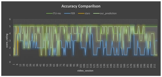 The similarities between the work of Raake et al. [] and our own lie in our similar aim, similar acknowledgment of traditional method limitations, and emphasis on the importance of QoE prediction accuracy. By contrast, our work has a different focus, on leveraging facial emotion recognition to comprehend user experience and estimate QoE. Raake et al. [] focused on a bitstream-based approach to estimate QoE extracted directly from video data, which is a purely technical approach. Raake et al. [] used pre-existing datasets and avoided user involvement; however, we utilized real-world data collected under network condition observations and viewer facial emotion conditions. Next, our work leveraged several machine learning models utilizing user star ratings, information ad insertion, user feedback, and facial emotion recognition as influential features, in contrast to Raake et al. [] who proposed a standardized statistical model based on technical video characteristics.