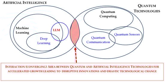 Area of the interaction between artificial intelligence and quantum technologies for promising path-breaking technologies and disruptive innovations. Note: Machine learning methods are a subset of artificial intelligence technology that develops algorithms directed to learn from data and generalize to unseen data, and, thus, performs tasks without explicit instructions. Deep learning techniques are a subset of machine learning methods that involves the use of neural networks to model and solve complex problems. Large language models (LLMs) are deep learning algorithms that can recognize, summarize, translate, predict, and generate content using large datasets. LLMs acquire these abilities by learning statistical relationships from text documents during a computationally intensive self-supervised and semi-supervised training process.