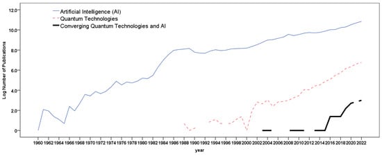 Despite the vast literature, quantitative works on the effects of interaction between emerging research fields and path-breaking technologies are lacking, to date. In particular, how the interaction of research fields can affect patterns of technological growth is a topic hardly known. This paper endeavors to analyze technological interaction and convergence to explain the symbiotic co-evolution of research fields and technologies and consequential scientific, technological, and social change. In particular, this study develops a statistical analysis that focuses on two emerging research fields and technologies given by artificial intelligence technology, in short, AI (the application of computer systems to mimic the problem-solving and decision-making capabilities of the human mind; [50]) and quantum technology, which applies the principles of quantum mechanics—the physics of sub-atomic particles—and has the potential to improve computing and communication technologies with manifold applications [50,51,52,53,54,55,56]. The study is based on a large dataset of publications and patents for technometric analyses that show how these research fields and new technologies evolve independently and with interaction processes of convergence [22,57,58]. This study is especially relevant in the presence of innovation-based competition and of processes of ‘creative destruction’ to clarify sources and dynamics of path-breaking technologies having a high potential of growth to support future industrial and economic change.