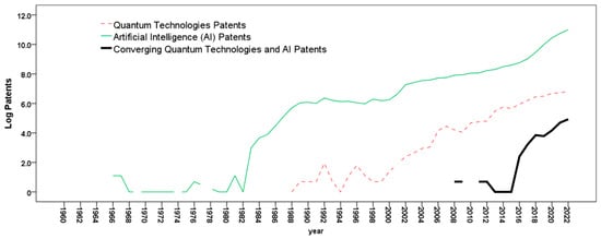 Technological trajectories using data of patents (log scale on y-axis for comparative analysis). The AI and quantum technologies line has an irregular pathway because of missing values in specific years of the dataset.