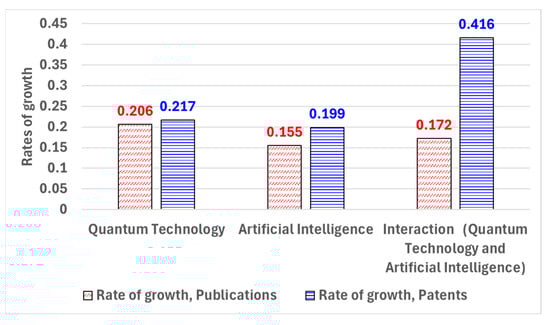 Rates of evolutionary growth of publications and patents in quantum technology, artificial intelligence technology, and their interaction (converging technologies).
