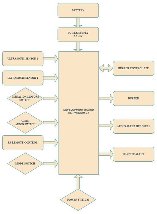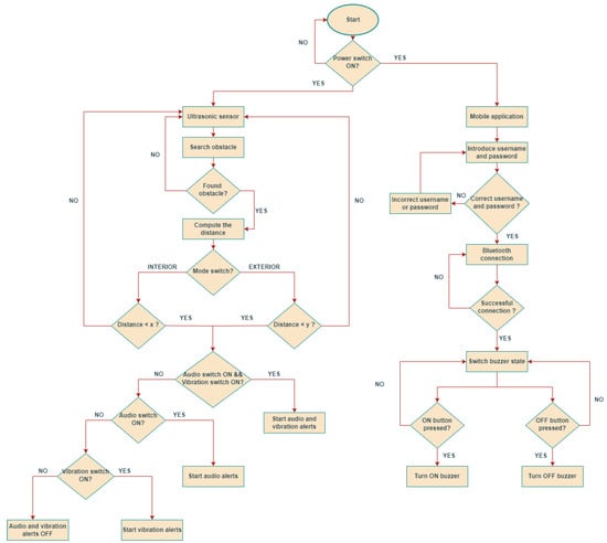 When the power switch is activated, the system initiates its operational functions, including the ultrasonic sensors and mobile application. Once the system has been initialized, the sensors commence scanning for obstacles. Upon the detection of an obstacle, the sensor data is transmitted to the microcontroller, where it is used to calculate the distance to the obstacle. The system mode (indoor or outdoor) is set by the system switch. If the obstacle is within a predefined distance threshold and both the haptic and sound alert switches are activated, an alert is triggered. In the event that only one alert switch is activated, the corresponding alert will be triggered.