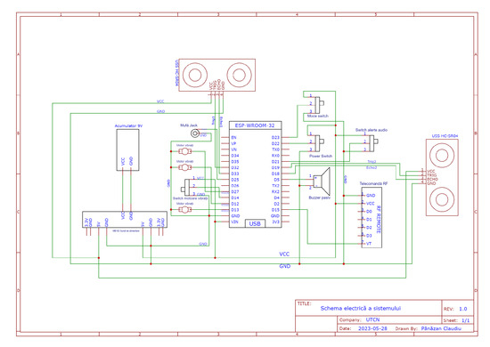 In Figure 8, the complete hardware diagram of the entire system, namely the smart cane for the visually impaired with ultrasonic sensors, is presented. This diagram was created using the EasyEDA (Standard) tool. It is a free and user-friendly program that can run both online and on a personal computer after being downloaded. The main purpose of this program is to create and simulate electrical schematics and printed circuit boards (PCBs).