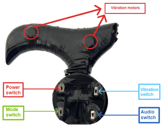 To integrate all the components into a functional and reliable system, their placement on the cane is based on their size and function. To ensure that users can feel the signals through vibrations, the position of the vibration motors was on the handle of the cane. Below the handle was created a space for the switches related to the cane’s functionalities.