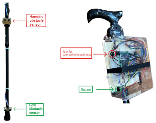 To explain the placement of other essential components, Figure 12 illustrates the assembly of ultrasonic sensors, the buzzer, and the Jack plug on the cane. The two sensors were placed at the base and approximately in the middle of the cane, angled at about 45 degrees to detect obstacles perpendicular to the user’s path.