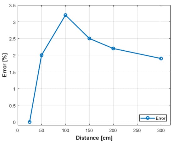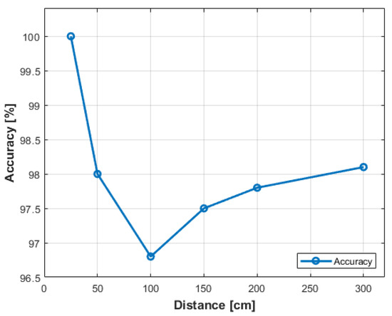From Table 3, it can be observed that the maximum accuracy, 100%, was achieved when the obstacle was placed at a distance of 25 [cm], while the lowest accuracy, 96.8%, was recorded at a distance of 100 [cm]. In Figure 15, the evolution of the system’s accuracy is graphically depicted based on the real distance at which the object was positioned.