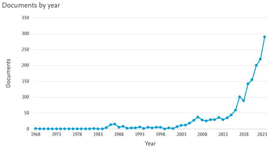 Annual number of publications in Scopus on the application of AI in power electronics from their appearance to 31 December 2023.