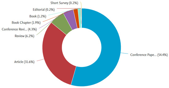These statistics are based on all publications indexed in Scopus. As a result, a total of 1707 publications were identified. It is seen that AI implementation in the power electronics field has increased dramatically, with significant momentum observed, especially in the last few years. Of interest is the breakdown of this information by document type in the database, which is presented in Figure 3, namely predominant conference papers (over 54%) and journal publications (over 31%).