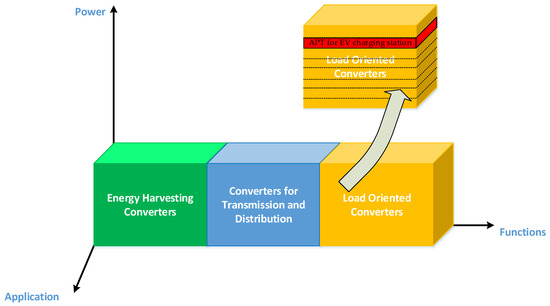In this sense, by surveying the multiple approaches used to formulate and formalize modularity in power electronics, the most common one is based on a broader identification of the conversion modules, as opposed to those that only consider the topology of the power circuits. Thus, with a view to conducting a complex assessment of the design process of power electronic devices and systems, the concept of “power electronics technology space” (PETS) was introduced [37]. The application of PETS is useful for presenting, on the one hand, the whole range of possible technologies for the realization of power electronic devices, and on the other hand, their applications and required powers. The power electronics technology space concept is visualized in Figure 7, with power electronic devices and their application areas systematized according to their use in the various stages related to the collection, distribution, storage and consumption of electrical energy.