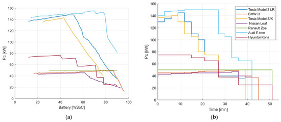 The modularity in power electronics provides new opportunities in the implementation of power electronic devices and systems, and through this approach, such technical and economic indicators of the final product are achieved that would not be obtained when using a single device. A very characteristic example of the impact of modular structures on improving the performance of power electronic devices is given in [38], where the design of an ultra-fast charging (UFC) system for electric vehicles (EVs) is investigated. It is known that the charging infrastructure is the most critical point in terms of hardware technology accompanying the electrification of transport due to the problems related to the power grid and the financial sustainability of this process. In the considered example, the main goal is to propose a method to reduce the installed power of the DC-DC converters, while maintaining the possibility of charging each electric vehicle with maximum power in each stage of the charging process. To achieve this goal, the application of a modular approach is proposed. In practice, due to the wide variety of electric vehicles available on the market, their charging capacity varies over a very wide range. Figure 8 shows the dependences of the consumed power required for a charge depending on the SoC of the battery (Figure 8a) and as a function of the charge time (Figure 8b) for several representative brands of electric vehicles. It can be seen that the required power varies from 150 kW for Tesla to 45 kW for BMW. In this sense, this makes it difficult to choose the optimal size for such a charging system: if a UFC station is sized for the maximum charging power allowed by electric vehicles, then it will operate most of the time at a lower power, thus leading to poor efficiency values, due to the incomplete load of the power electronic devices. On the other hand, insufficient installed power will create problems related to ensuring the necessary consumption by individual customers at any given moment of time. In the example, a charging station suitable for charging the seven types of electric vehicle indicated in Figure 8 is considered. The studied station consists of ten charging columns, each of which was chosen to provide 175 kW of power, and thus a total maximum power of 1.75 MW was obtained. This is the theoretical maximum peak power, assuming that ten vehicles, randomly selected from the seven models presented earlier, occupy the ten columns at the same time and all consume maximum power. After applying stochastic methods, it was found that a UFC plant with a maximum power of 1 MW is possible to satisfy more than 97.6% of the likely demand scenario. It is important to clarify that the calculated peak required power has no dependence on a specific time of day, and is a theoretical peak used to determine the base size of an ultra-fast charging station. Furthermore, the authors specify that the power conversion efficiency was not considered when constructing the probabilistic model. The main task is to find a solution to reduce the total installed power for the DC-DC converters, while maintaining the possibility to charge the electric vehicles at the maximum power at any given time.
