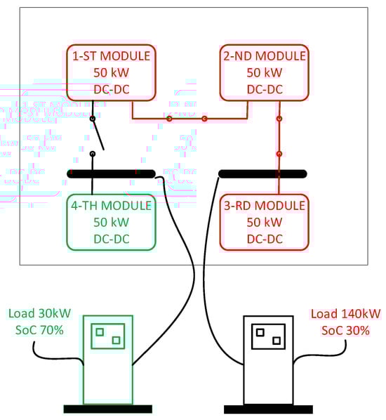 In the proposed modular approach, the DC-DC part of the UFC station consists of 20 identical 50 kW modules that can be shared between adjacent charging ports depending on the possible power switch configurations. The size of the individual module of 50 kW has been determined with a view to achieving a charge of a maximally discharged vehicle with the lowest required power. An example configuration for charging two vehicles with different power and SoC of the battery is shown in Figure 9. Depending on the energy needs, the less charged EV (SoC 30%) uses three converters of 50 kW, and the better charged (SoC 70%) one of 50 kW. In this sense, one of the main tasks in the application of the principle of modularity is the determination of the optimal size of the individual module, as this is related to the consideration of a range of technical and economic factors, such as the price per square meter of installed power, weight and dimensions, complexity of management, characteristic load efficiency, reliability, temperature regime, etc.