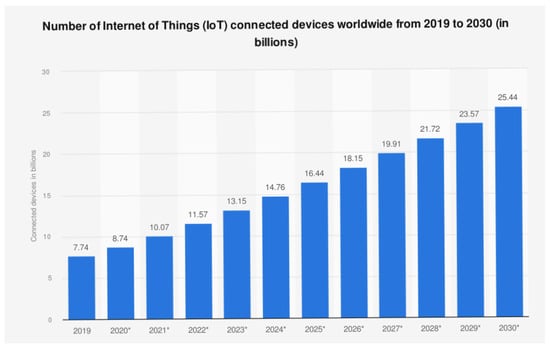 During the past ten years, there has been a growing interest in wireless communication technology, and the number of IoT devices has risen significantly. It is forecasted to reach more than 26 billion devices connected to the Internet by 2030 [1], as depicted in Figure 1. These devices generate a large volume of data per second, have limited computing power, small memory capacities, and lack the self-sufficient intelligence to process raw data locally and make independent decisions. Resource-constrained IoT devices include sensors, smart fridges, and smart lights.
