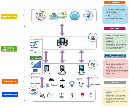 Furthermore, Figure 2 illustrates the significance of machine learning within the IoT infrastructure. ML techniques are applicable at various points, including IoT nodes, edge or fog servers, and cloud servers, adapted to suit the requirements of the specific application.