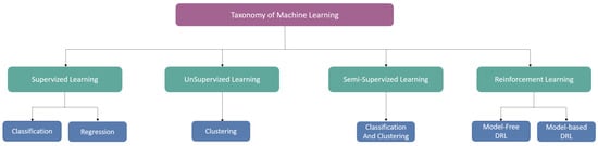 Machine learning (ML) is a subset of artificial intelligence (AI) focused on improving performance through automatic learning from experience. ML relies on training machines with large datasets to make better decisions. As defined by Mitchell, ML involves learning from experience E to improve performance measure P on tasks T [5]. ML algorithms can be classified into four major categories: supervised, unsupervised, semi-supervised, and reinforcement learning. Figure 3 demonstrates a detailed taxonomy of ML algorithms.