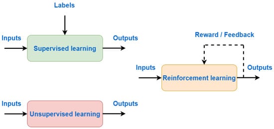 Unsupervised learning analyses datasets without predefined outputs, focusing only on the provided input. Its objective is to identify patterns and structures within unlabeled data. Unlike supervised learning, there are no provided outcomes, the system observes only input features and aims to cluster data accordingly [14,15]. Clustering is among the most widely used unsupervised learning methods. It splits the data into groups according to similarity. Data with similar features are placed in the same groups, while dissimilar points are placed in other groups. Clustering is mostly used in video-on-demand, marketing, smart grid, etc. Figure 4 illustrates the concepts of supervised, unsupervised, and reinforcement learning.