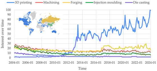 Global public interest trends for “3D Printing” and other traditional manufacturing processes. Source: extracted from “Google Trends” on 12 January 2024.