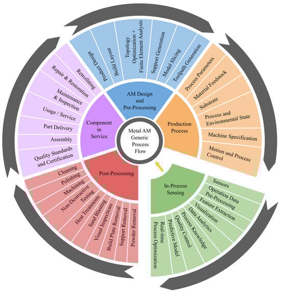 Implementing metal AM entails a structured process flow that includes five key steps: model generation and preparation, the AM build process, in-process sensing, post-processing, and integration into service, as shown in Figure 2.