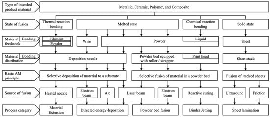 Additive Manufacturing (AM) is the term preferred by the International Organization of Standardization (ISO) and American Society for Testing and Materials (ASTM) standards, instead of three-dimensional (3D) printing. AM processes start by taking the information from a Computer-Aided Design (CAD) file that is later converted to a stereolithography or Standard Tessellation Language (STL) file, which slices the 3D model drawing into numerous small triangles for mesh generation that holds the information of each layer. Subsequently, the process involves printing successive layers of materials that form a 3D object following the desired CAD design. The general definition of AM, in accordance with ISO/ASTM 52900 [], is “a process of joining materials to make parts from 3D model data, usually layer upon layer, as opposed to subtractive manufacturing and formative manufacturing methodologies”—which, respectively, remove material from an initial bulk volume or shape objects from pre-fabricated dies. The adoption of this standard serves a dual purpose: it not only harmonizes the transition from design concept to production, enhancing global competitiveness and collaboration, but also ensures a universal understanding among diverse stakeholders. This includes industries, academic institutions, and society at large, aiming to eliminate ambiguities and foster a unified approach to AM processes.