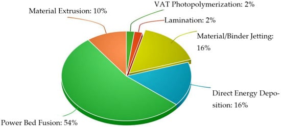 An in-depth examination of the literature categorizes metal AM technologies based on various factors, such as their energy source, feeding material type, feedstock distribution system, basic AM principle, and layer bonding technique (fusion or non-fusion based), as illustrated in Figure 3. Metal AM involves several types of fusion, including melted, solid, chemically bonded, or thermally bonded. The type of fusion depends on the energy source used during the process, such as high-energy beams like electrons, plasma arcs, and lasers, or other methods like ultrasonic or friction, reactive curing, and heated nozzles. Feedstock materials come in various forms, such as wire, powder, or sheet. In exceptional cases, special bonding techniques may be required; for instance, a liquid binder may be necessary to selectively cure pre-laid powder, or powder may be infused within the filament form. Depending on the technology, material distribution can be achieved through nozzle deposition or a pre-laid powder bed with roller/scraper and sheet stack. Also, in some cases, a print head is necessary to selectively deliver the liquid binder, instead of the feedstock material, onto the pre-laid powder bed. Based on these factors, we can classify five distinct metal AM families. These five distinct families—Material Extrusion (ME), Binder Jetting (BJT), Sheet Lamination (SL), Powder Bed Fusion (PBF), and Directed Energy Deposition (DED)—each have unique advantages and applications [,,,,,,,,,,,,,,,,,,,]. According to 2020 market share data [], as illustrated in Figure 4, PBF technology dominates industrial adoption with over 54% of the market share. DED technology follows closely behind and is on par with the combination of BJT and Material Jetting technologies, equivalent to 16%, respectively. ME and SL technologies are the least utilized in the industry. However, a recent report in 2024 indicates that the global AM with metal powders market has seen drastic growth in DED, reaching almost 35% of the market share, whilst PBF technology remains stagnant at 54.4% []. The report from Market.Us shows an increasing global market trend of metal-powder-based AM in terms of market growth by type [].