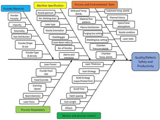 Secondly, the production process commences with the preparation of the machine setups and materials. While some variables are predetermined (constant), others are latent, making them difficult to monitor. Material feedstock, substrate characteristics, and machine specifications are among those variables that are constant. Additionally, other environmental factors such as carrier and shielding gases, plasma distribution, spatters, and whether the atmosphere is opened or closed are often latent variables that require monitoring []. However, some of these factors can be controlled and adjusted as needed before or during the process. This is achieved by optimizing process parameters based on a selected material database, motion, and process control. Parameters such as laser power, scan speed, material feed rate, hatch spacing, inter-layer dwell time, and scan strategy can be adjusted to achieve the desired outcome. Further details on this production process and its key parameters can be found in Section 3.2. Section 4 provides an explanation of how these parameters are linked to the quality of the process and how defects can arise as a result.