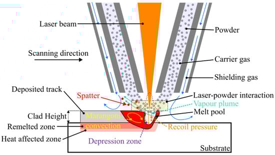 Despite these insights, a comprehensive understanding of the governing mechanisms and their interactions—both synergistic and antagonistic—are yet to be fully grasped. Numerous studies have attempted to describe the mechanisms and effects of various DED process parameters on the deposited geometrical characteristics, material microstructure, and defect formation [,,]. The DED process is governed by the complex interplay of various process parameters, including powder particles, substrate, inert gas, and laser beam characteristics. These interactions, occurring instantaneously, are challenging to observe with the unaided eye. Therefore, a deep understanding of melt pool behaviour and characteristics is essential, as it directly correlates with the quality of the deposited track/clad.