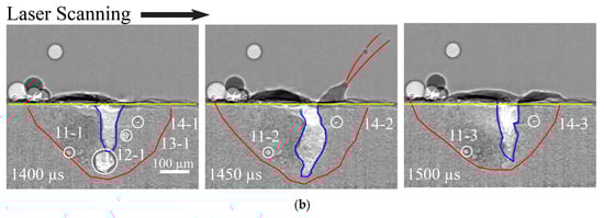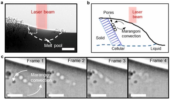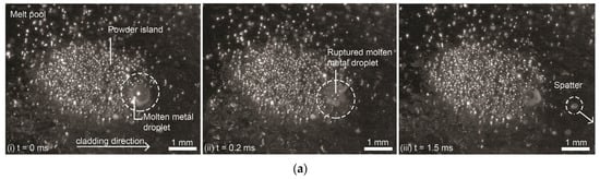 Leung et al. [] highlighted that the mechanism for tracking growth critically relies on the vaporisation of the material, which exerts downward forces (recoil pressure) onto the melt pool to create a depression zone. This action, together with surrounding gases, helps entrain powder particles into the melt pool. Ki et al. [] further added that both thermocapillary force (Marangoni) and recoil pressure are the primary drivers of melt pool flow and its stability. The extremely high temperatures generated by the heat source can cause the melt pool surface to exceed the material’s boiling point, increasing pressure within the molten material. This recoil pressure, resulting from the vaporization of metal, creates a high-velocity vapor plume. Increased vapor recoil can provide enough energy for the vapor plume to exit the keyhole and eject particles, a phenomenon known as spatter [].