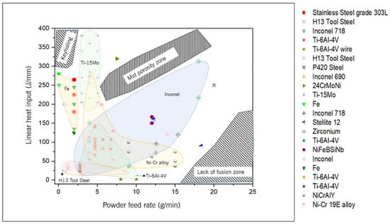 Furthermore, material versatility in DED technology remains limited because certain alloys are prone to issues such as oxidation (highly reactive alloys: magnesium alloys) and vaporization of elements (low melt point alloys: zinc alloys) during the deposition process [,]. Subsequently, when mixing different materials (e.g., titanium aluminides) in DED, the varying melting temperatures of each constituent require specific heat inputs, potentially causing selective vaporization of elements with lower melting points, leading to difficulties in achieving uniform melting and solidification []. Differences in density and liquid surface tension can lead to the segregation of alloying elements during rapid solidification, dimensional inaccuracies, porosity, and unmelted particles. Meanwhile, PBF has a controlled environment, and rapid cooling can help mitigate these issues, making it a better choice for alloys with complex compositions or those prone to segregation and oxidation. Mixing different materials lowers powder efficiency and recyclability compared to PBF [].