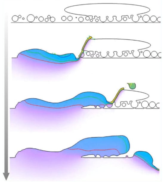 In DED applications, the formation and dynamics of the melt pool play a pivotal role, bearing resemblance to the processes observed in laser welding. The melt pool serves as the starting point of the fabricated part, making its morphology a key indicator of process effectiveness. A consistent melt pool size is strongly correlated with high part quality []. The shape of the melt pool depends on various factors during the DED process, as illustrated in Figure 5. As illustrated in Figure 6, the melt pool’s morphology is characterized by a region of superheated molten metal appearing near the interface of the feedstock and energy source. It assumes a spherical shape dictated by the prescribed speed based on the scan strategy. The melt pool is subject to a variety of complex physical phenomena, including heat dissipation through convection and radiation, phase changes, and heat conduction, as well as Marangoni convection due to the thermocapillary effect, which influence the Marangoni flows induced by temperature gradients []. Additional physical phenomena, including vapour plume effects, gravity, recoil pressure, and spatters, further shape the melt pool characteristics [,,]. These dynamics are critical for determining the quality of the printed part, showcasing the intricacies of the process.