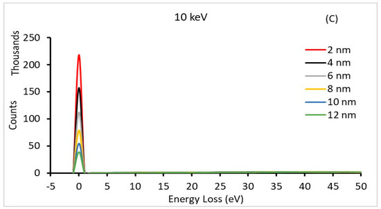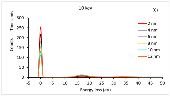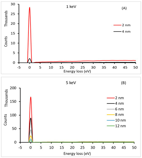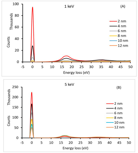 Figure 1 and Figure 2 show the energy loss spectra of Si and Au with different thicknesses, respectively, at different primary electron energies (1, 5, and 10 keV). The zero-loss energy peak clearly has a maximum value at a 2 nm film thickness and decreases with increasing thickness. As the thickness increases, the probability of plural scattering becomes more significant, causing the spectral shape to deviate from the single scattering distribution and the intensity of the zero-loss energy peak to become smaller [18]. Furthermore, the peak increases as the primary electron energy increases (i.e., 10 keV). This behavior was due to the increased mean free path length of the primary electrons. In addition, primary electrons with higher energies inside a low-atomic-number material (e.g., C and Si) are subject to less inelastic scattering [32,33]. Consequently, the volume of the primary electron–thin film interaction within the sample decreases as the energy increases or the thickness decreases. This allowed most of the primary electrons to be transmitted from the film at high energies (e.g., 10 keV). The intensity of the zero-loss energy peak decreased as the film thickness increased. This is to be expected, as thicker films (in terms of primary electron energy (e.g., t = 10 nm at 3 keV)) cause primary electrons to lose energy owing to more inelastic scattering with film atoms. This results in an increase in the number of electrons in the transmitted electron background spectrum with an energy lower than the primary energy. This is illustrated in Figure 1B,C, where the plasmon electron peak increases with the film thickness. The plasmon peak was superimposed on the transmitted electron background spectrum.