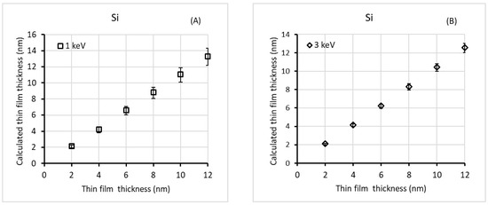 To understand the results for the light elements, the calculation for the Si thin film was investigated (Table 2 and Figure 3). The percentage error in tc is approximately 5% at 1 keV for a thickness of 2 nm and increases to 10% for a film thickness of 12 nm. By investigating the ratio t/λ, it can be observed that the ratio increases with increasing film thickness. t/λ = 1.06 to 6.39 for 2 nm and 12 nm, respectively. The latter is inconsistent with the assumption introduced in the literature [15,18] that t/λ should not be greater than 5. This is reflected in the percentage error of tc, which was approximately 10%. This can be explained by the fact that the primary electron range is small; therefore, most of the electron–solid interaction volume is covered by the sample [13,35]. This implies that the primary electrons are subjected to more inelastic scattering events. Therefore, the number (intensity) of transmitted electrons of the zero-loss energy is considered to be small compared to the total number of electrons transmitted. Therefore, the percentage error increases to approximately 10%. However, at a thickness of 2 nm, the percentage error is 5%. This is because of the interaction volume of the primary electrons and the sample atoms that are not covered by the sample. Therefore, more electrons can transmit through the sample without energy loss after low elastic scattering events. At 10 keV, the inelastic mean free path length is 12.39 nm, which is larger than the tested Si thickness (12 nm). This was reflected in the calculated thickness (tc), with a percentage error of less than 3% at a thickness of 2 nm, where t/λ < 1. For primary electron energies of 3, 5, and 7.5 keV, where λ = 4.58 nm, 6.97 nm, and 9.81 nm, respectively, the calculated tc had a maximum percentage error of 5%. In general, the percentage error decreases as the tc/λ ratio increases. These results show that the thin-film calculation using Equation (2) for light elements can be conducted by low-energy primary electrons with a low percentage error below 5% for primary electrons above 1 keV.