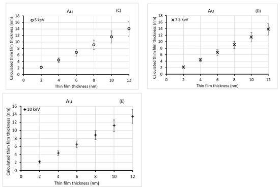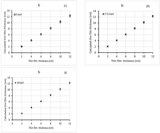 Figure 3. The calculated C thin-film thickness versus the accepted thickness value in (nm) at different primary electron energies (A) 1 keV, (B) 3 keV, (C) 5 keV, (D) 7.5 keV, and (E) 10 keV.