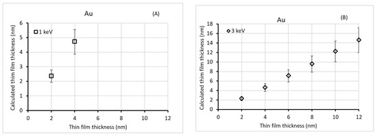 For the heavy elements, the film thicknesses obtained from the Cr, Cu, Ag, and Au samples are shown in Table 3, Table 4, Table 5 and Table 6 m, respectively. The maximum percentage error was found for Au film thicknesses greater than 6 nm at 3 keV (Table 6 and Figure 4B). This can be explained by the increase in the number of inelastic scattering events that the primary electron could experience before being transmitted. As the primary electron energy increases, the number of inelastic scattering events decreases, and the number of elastic scattering events increases. Therefore, the number (intensity) of electrons with zero loss energy increases. In general, the percentage error of the calculated film thickness decreases as the primary electron energy increases and the film thickness decreases. For Au, which is considered as a heavy element, as shown in Table 6 and Figure 4, the lower percentage error (around 8%) was found at a 2 nm film thickness and 10 keV, where λ = 6.86 nm and t c λ < 0.29 . As the thin-film tc increases, the percentage error increases as the ratio of t/λ increases. This observation is contrary to that observed for Si. The influence of the elastic peak increased with heavy elements (e.g., Au). This keeps the primary electrons close to the bombarded surface. Therefore, a few electrons with zero-loss energy were transmitted from the sample, and more primary electrons became part of the spectrum background. As a result, the ratio of transmitted to background electrons decreases. This was reflected in the accuracy of the film thickness measurements at t ≥ λ. It is known that the measured data for the inelastic mean free path length of Au at high energies are overestimated by more than 10% [22,35]. Therefore, the use of the λ values of Au presented in Equation (2) reflects the film thickness calculation. The percentage error in the film thickness calculation at high primary electron energies (e.g., 10 keV and t > 8 nm) was approximately 10%.