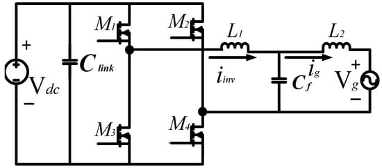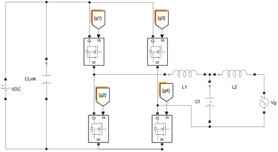 The analyzed system uses an LCL filter, connected to a single-phase full bridge inverter and the grid as shown in Figure 2. The SPWM modulation activates and deactivates the gates that make up the full bridge inverter. The generated signal passes through the LCL filter, which is used to reduce the harmonics of the current to be injected into the grid.