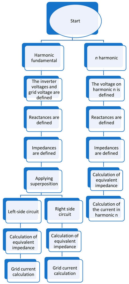 One previous analysis of this type was performed for an L-filter connected to the grid and was published in []. In this paper, to analyze the performance of the LCL filter, a Fourier analysis was performed to identify each of the harmonics in the inverter output voltage. Figure 3 shows a flow chart describing step by step how the mathematical analysis with the fundamental and n-harmonics is organized.
