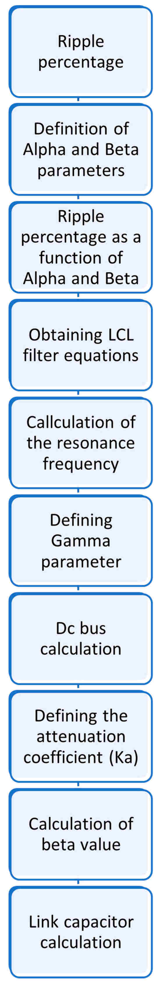 Figure 4 shows a step-by-step diagram of the mathematical analysis of the current ripple percentage from which the proposed values and parameters for the LCL filter are obtained.