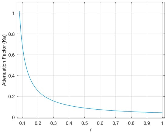 Figure 8 shows that to have a lower attenuation coefficient, the beta should be close to 1. In this work, the beta chosen in this paper—β—is the ratio of L1 and L2. Therefore, β is the inverse of r. This is shown in Equation (59). In this paper, the parameter beta will be equal to 1.