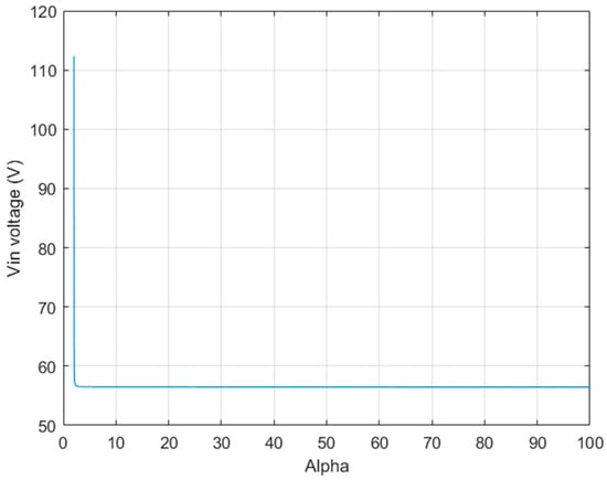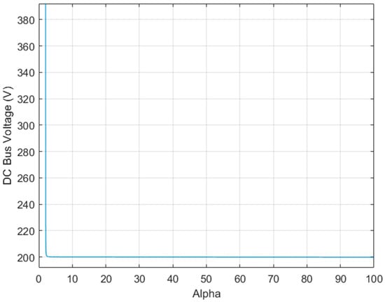 Equation (56) was evaluated using the data from Table 2 to obtain the value of the DC bus. This is shown in Figure 9.