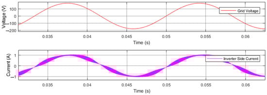 Figure 26 shows the grid voltage (upper signal) with a peak magnitude of 180 V on a scale of 60.0 V/div. Also shown is the grid current (lower signal) with a measured magnitude of 1 A on a scale of 1.00 A/div. The data obtained from the spectrum analyzer are exported to Simulink, and the FFT shown in Figure 25 is calculated.
