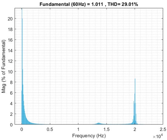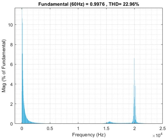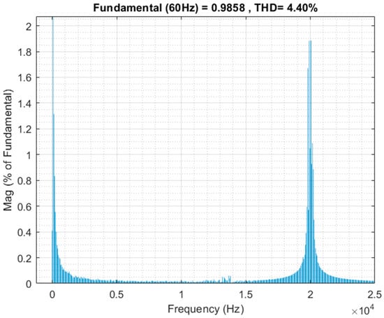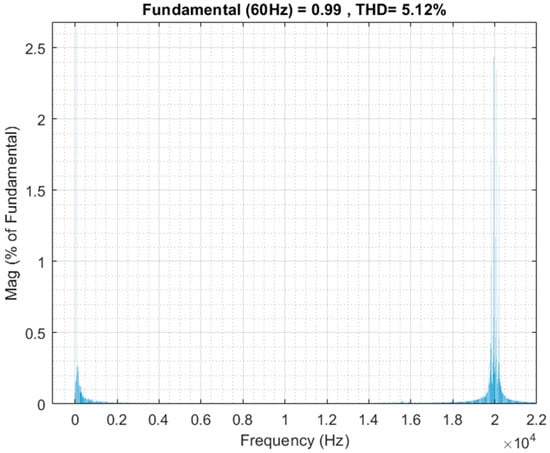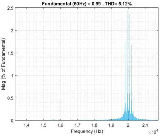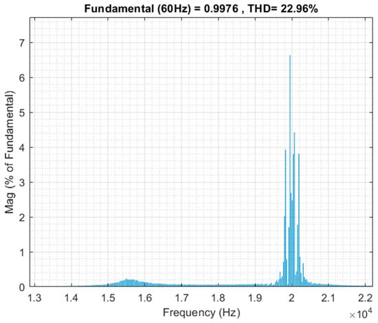 Figure 27 shows the magnitude of the harmonics obtained with the data (Figure 24). The magnitude of harmonic n (19,940 Hz) is less than 2%. The magnitude of the harmonics close to the resonance frequency is smaller than the magnitude of the harmonics close to harmonic n. The THD calculated from the experimental data for the grid current was 4.4%, thus complying with the IEEE standard.