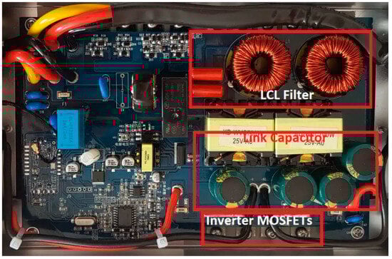 Solar energy is transformed into electrical energy using photovoltaic panels (PVs). This electrical energy is then connected to the grid or isolated loads through power converters. This collection of components is known as a photovoltaic system [,,,,,]. The basic block diagram of a typical single-phase PV is shown in Figure 1. This system consists of a photovoltaic panel, a DC–DC converter, a link capacitor between the DC–DC converter and the inverter, an output filter, and the grid [,]. The blocks shown are those present in a commercial PV system. This work is focused on the design of the output LCL filter.