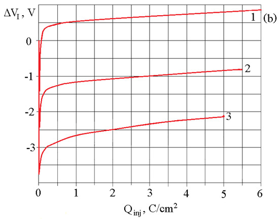 The accumulation of a negative charge is correlated with the capture of electrons in the bulk of the gate dielectric on the initially existent and newly generated electron traps [8,27,28,29,30]. This effect corresponds to a positive voltage increase across the MIS structure (Figure 2a,b). Obtained from Figure 2, the experimental results are in good qualitative agreement with the results of other researchers that were obtained for similar MIS structures [27,30,42,43].