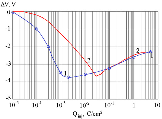 Two of the one-hundred studied MIS capacitors have higher changes in the charge state of the gate dielectric in comparison with the results presented in Figure 1 and Figure 2. The breakdown of these capacitors happened at the initial stage of testing. Apparently, the capacitors have rough external defects that correlate with the presence of impurities or structural defects. For the remaining 35% of the MIS capacitors, with external defects and experiencing the breakdown at injected charge values up to 1 C/cm2, the change in the dielectric charge state remained mainly close to the experimental data shown in Figure 1 and Figure 2, with the only difference being the earlier breakdown of the dielectric. This result is well-explained by the previously discussed models, in accordance with which the area of the external defect is many times smaller than the area of the MIS capacitor, and the local change in the charge state in the defect spot has a small effect on the overall change in the charge state of the sample under study.