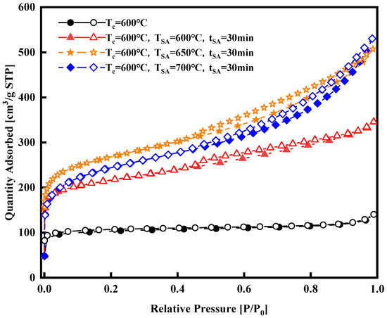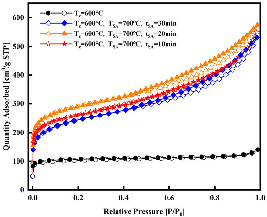 In addition to carbonization temperature, both activation duration and activation temperature significantly impact the characteristics of activated carbon [15]. This study focuses on the activation temperature and duration time as experimental variables to optimize the activation process. Nitrogen adsorption experiments were conducted to analyze surface area, pore volume, and size distribution. Nitrogen adsorption isotherms are provided concerning the activation temperature and duration, respectively, as shown in Figure 3 and Figure 4. Figure 3 illustrates a significant enhancement in the isothermal adsorption curve following steam activation compared to that of the samples that underwent carbonization only. The isotherm of the carbonized-only samples falls under Type I, dominated by micropore adsorption. In contrast, the isotherms of the activated samples are a blend of Type I and Type IV, indicating the development of micropores during activation, as evidenced by the rapid increase in all three curves at low relative pressures (less than 0.1 MPa), which surpasses that of the carbonized-only samples. However, all three isotherms exhibit an H4-type hysteresis loop associated with multilayer adsorption and capillary condensation in mesopores, suggesting the generation of some mesopores during activation. As the adsorption pressure increases, the curve at a 650 °C activation temperature slightly surpasses that at 700 °C as the relative pressure approaches 1.0 MPa. At this point, the 700 °C isotherm shows a greater level of adsorption, indicating that during the 30 min activation period at 700 °C, some micropores transitioned into mesopores compared to the conditions at 650 °C.