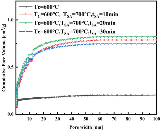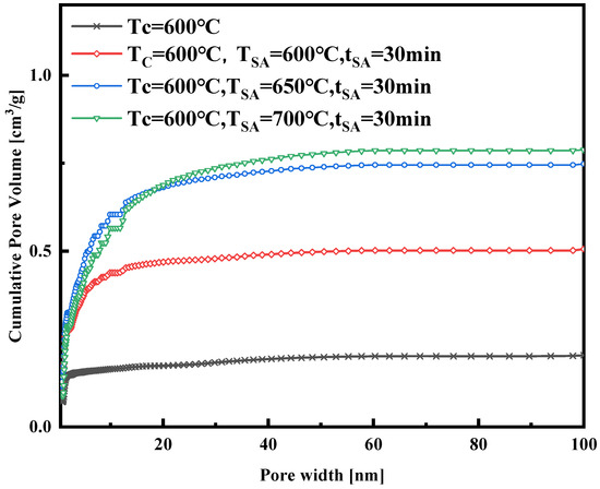The cumulative pore volume of the samples synthesized with different activated temperatures.