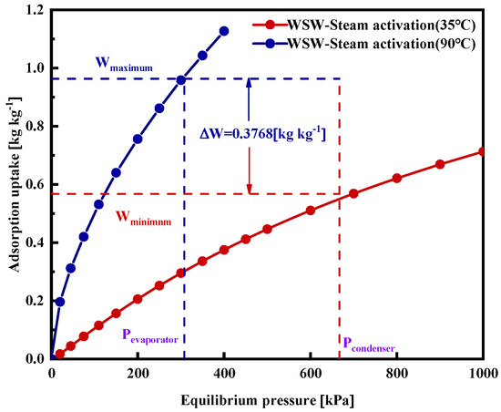 The D–A model and the Tóth model both demonstrate effective fitting results. Yet, due to significant burn-off occurring during the activation process in activated carbon adsorbents, there is an increase in adsorbent heterogeneity. As a result, the D–A model is better suited for forecasting the adsorption isotherms of activated carbons at different temperatures [28]. Figure 11 represents the net uptake during the adsorption cooling cycle with the WSW–A700–20/HFO-1234ze(E) pairs. The operating temperatures for the evaporator, adsorption, and desorption bed are 10 °C, 30 °C, and 85 °C. The effective uptake, calculated using Equation (5), amounts to 0.3768 kg kg−1.