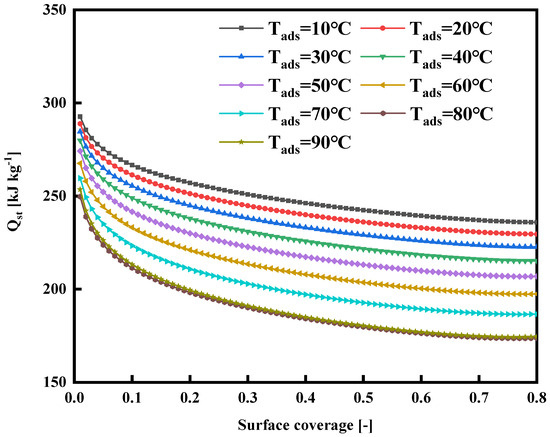 in Equation (6) denotes the surface coverage, and the equation to calculate the surface coverage is listed in Equation (7). Figure 12 shows the relationship between the surface coverage of the WSW–A700–20/HFO-1234ze(E) working fluid combination at different adsorption temperatures and the isosteric heat of adsorption. Observing the graph, because of the decrease in the specific enthalpy of evaporation in the region below the critical temperature, it is clear that the isosteric heat of adsorption decreases as the temperature rises. Furthermore, at various temperatures, the isosteric heat of adsorption decreases as the adsorbate loading increases. This trend is elucidated by referencing the pore size distribution diagrams found in Figure 5 and Figure 7. These diagrams highlight the prevalence of predominantly micropores in the synthesized activated carbon, each varying in size. During the initial adsorption phase, HFO-1234ze(E) quickly adheres to sites with elevated energy levels. As the adsorption process continues, molecules begin to adhere to sites with diminishing energy levels. Initially, HFO-1234ze(E) molecules infiltrate the narrow pores of WSW–A700–20, resulting in relatively strong interactions between them, hence producing higher isosteric heat values at lower loadings. However, once the smaller pores become fully saturated, HFO-1234ze(E) molecules gradually occupy the larger pores, gradually weakening the isosteric heat of adsorption [4].