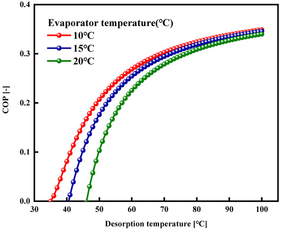The specific cooling effect (SCE) and the coefficient of performance (COP) are identified as the most pivotal performance indicators of the adsorption cooling systems. A simulation and calculation of the SCE and COP were conducted for the adsorption cooling cycle utilizing the WSW–A700–20/HFO-1234ze(E) working pair. The SCE was calculated using Equation (8). Figure 14 illustrates the trend of SCE in terms of desorption temperatures at three distinct evaporator temperatures (10 °C, 15 °C, and 20 °C). It is discernible from the graph that there is a roughly proportional relationship between the SCE and the desorption temperature. This phenomenon can be attributed to the enhancement of the net adsorption uptake as the desorption temperature elevates. Furthermore, it is observed that the SCE increases with a decrease in evaporator temperature. This increment can be ascribed to an increased maximum adsorption capacity resulting from lower evaporator temperatures, amplifying the SCE value.