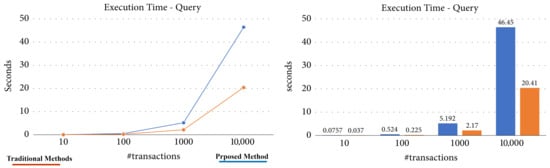 To assess execution time, variations in the number of transactions were implemented, enabling a comparison of the execution time for different operations. The execution time of two queries was investigated. In general [], an increase in the number of transactions correlates with a corresponding increase in the time taken by the processes. Figure 5 illustrates this relationship, with the y-axis representing time and the x-axis denoting the number of transactions.